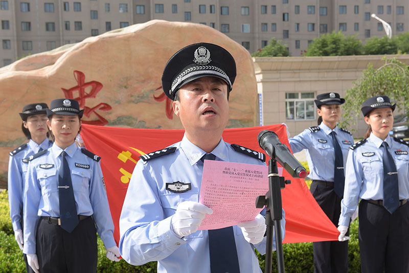 仪式开始后,副政委张金荣带领全体党员重温入党誓词,全体党员民警面对鲜红的党旗举起右手,庄重地再次重温了对党庄严而神圣的誓言。